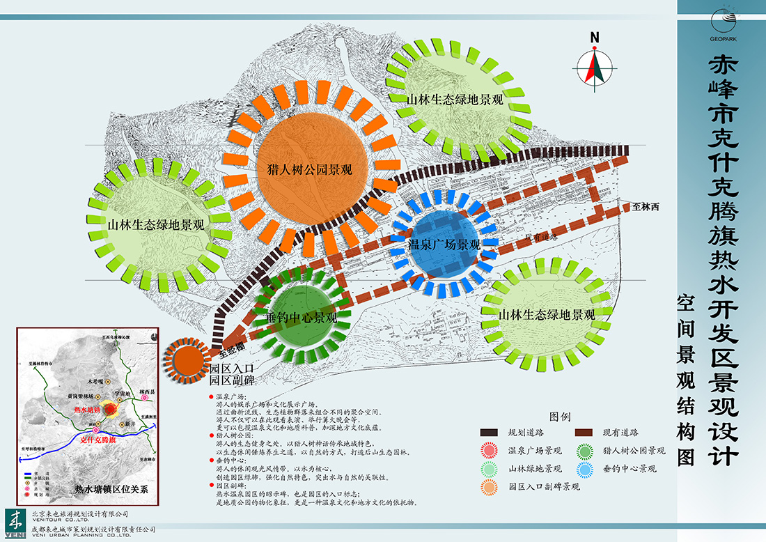 本規(guī)劃通過對周邊環(huán)境、地理位置以及人的心理、行為習(xí)慣進(jìn)行深入細(xì)致分析,借助曲折流線、生態(tài)植物群落來組合不同的聚合空間。以水為核心,強化自然特色,突出水與自然的關(guān)聯(lián)性。以獵人樹神話傳說為依托,構(gòu)建一處既能在此祭拜敖包、瞻仰獵人精神的文化公園,又融入革命歷史紀(jì)念碑,形成旅游文化展現(xiàn)地。以人文歷史傳承地域特色,以生態(tài)休閑獲取養(yǎng)生之道。依托熱水塘豐富的溫泉資源和深厚的文化底蘊,設(shè)計出了具有蒙古族特色的服務(wù)設(shè)施和旅游產(chǎn)品,延長了來訪游客的停留和消費時間。在改善當(dāng)?shù)鼐用癍h(huán)境的基礎(chǔ)上,也提升了熱水塘的旅游產(chǎn)業(yè)。
