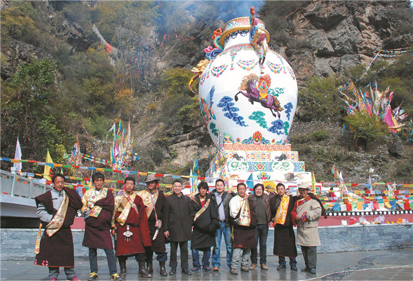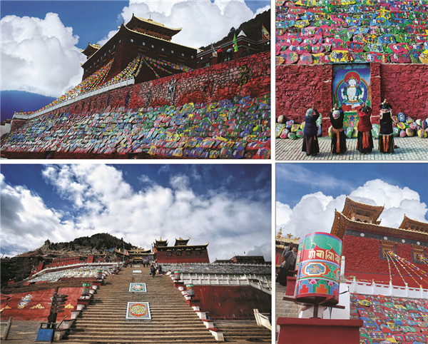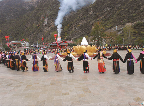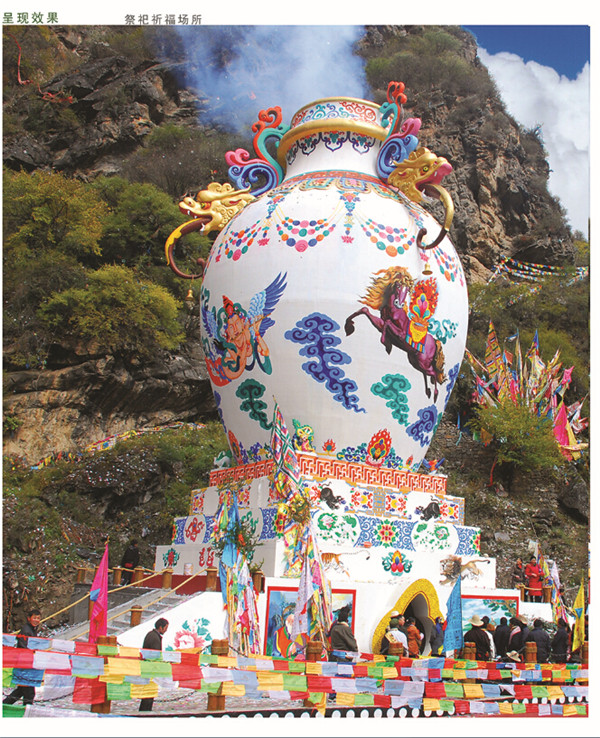 煨桑是藏區(qū)神秘的原始祭祀祈福儀式。在煨桑廣場新建全世界規(guī)模最大的煨桑塔,高18米,塔身為5層四方形基座,采用吉祥八寶(寶傘、寶魚、寶瓶、白海螺、吉祥結(jié)、勝利幢、金法輪、蓮花)壁畫做裝飾,塔身以寶瓶為原型,白色底漆上祥云繚繞,五彩飛馬,裊裊梵音等元素,體現(xiàn)了濃郁的藏族宗教色彩和民俗特色。整個煨桑塔體量巨大,色彩鮮艷,在四周經(jīng)幡的映襯下,極具視覺沖擊力和感染力。