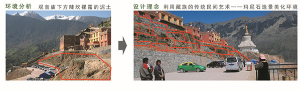 觀音廟下方陡坎原為裸露的泥土,景觀效果較差,影響景區(qū)形象。因此,規(guī)劃創(chuàng)意性地利用藏族的傳統(tǒng)民間藝術(shù)——瑪尼石,采用造景的設(shè)計手法,通過層次化的堆砌成墻方式對裸露的堡坎進行遮擋。這些石片大小不一,成千上萬,全部通過信徒捐建,在原石片的基礎(chǔ)上,雕刻有各種經(jīng)文、佛像、神獸等,內(nèi)容豐富、造型生動且富有靈性,是瑪尼石的文化大觀園。