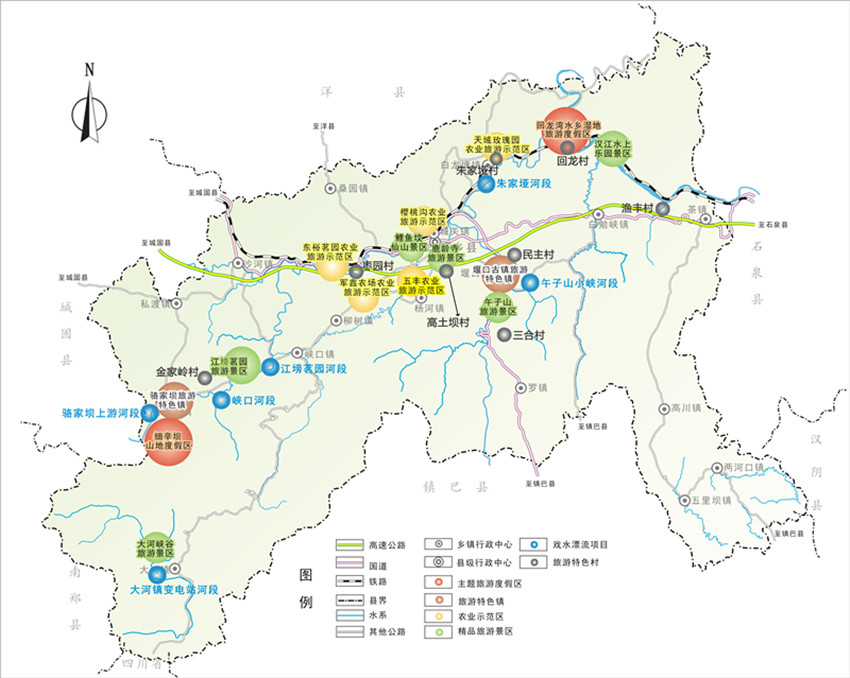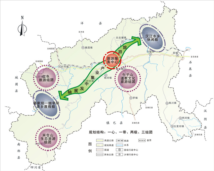 本規(guī)劃以全域旅游為指導(dǎo),主要從產(chǎn)業(yè)、產(chǎn)品和保障體系層面解決打造秦巴鄉(xiāng)村休閑度假旅游目的地的難題。產(chǎn)業(yè)層面,以茶鄉(xiāng)、水鄉(xiāng)、自然香等為主題,構(gòu)建兩個(gè)主題旅游度假區(qū)、兩個(gè)旅游特色鎮(zhèn)、五個(gè)農(nóng)業(yè)旅游示范區(qū)、六個(gè)精品景區(qū)、六處嬉水漂流區(qū)、八個(gè)旅游特色村。產(chǎn)品層面,打造集茶文化養(yǎng)生、茶主題度假小鎮(zhèn)休閑、水鄉(xiāng)濕地觀光、鄉(xiāng)村度假、水上運(yùn)動(dòng)與休閑、紅色旅游觀光、農(nóng)業(yè)旅游休閑等為一體。保障體系層面構(gòu)建大河壩鎮(zhèn)至西鄉(xiāng)子午鎮(zhèn)的快速旅游通道,縮短西安——西鄉(xiāng)的時(shí)間距離至3.5小時(shí);構(gòu)建自駕車(chē)營(yíng)地和綠地系統(tǒng),形成“快進(jìn)、漫游”體系。