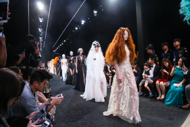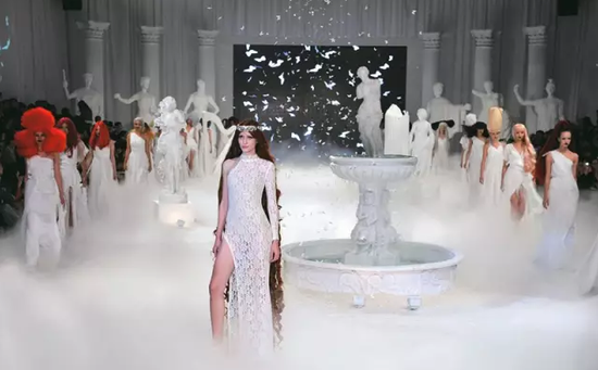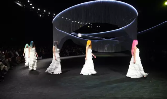 風(fēng)雪中,未被人類(lèi)浸染的自然之美首發(fā)開(kāi)場(chǎng),輕靈、優(yōu)雅,精靈般的波浪長(zhǎng)發(fā)無(wú)拘無(wú)束,仿佛回到那純凈的時(shí)空之中;伴隨著雷聲,“金色之雨”象征的人工浪潮席卷而來(lái),線(xiàn)條凌厲冷艷,卻也帶出別樣的美感;時(shí)空轉(zhuǎn)換,純粹簡(jiǎn)約的造型交織出相互依存的美感,脆弱而曖昧,“美妙共生”的狀態(tài)就此誕生。