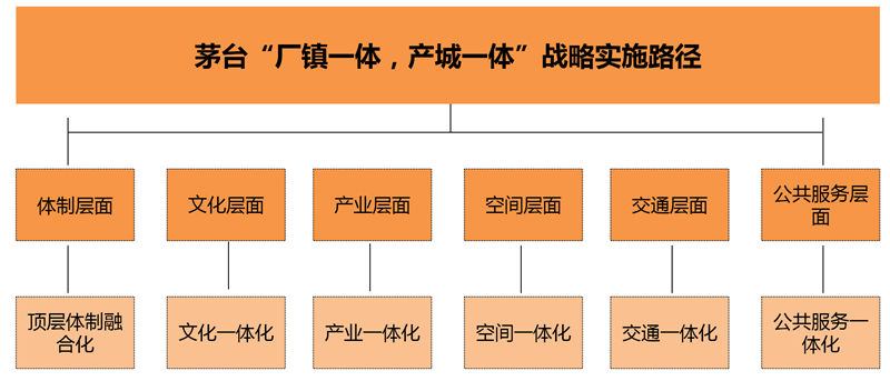 為解決這些問題,“總體規(guī)劃”首先明確了“廠鎮(zhèn)一體,產(chǎn)城一體”的總體發(fā)展戰(zhàn)略, 并從體制、文化、產(chǎn)業(yè)、空間、交通、公共服務(wù)等六個層面來落實茅臺廠鎮(zhèn)一體發(fā)展戰(zhàn)略。