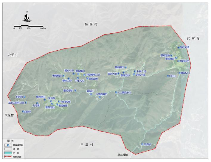 本次規(guī)劃范圍包括龍池村村域范圍,涉及4個組、龍池山以及村落周邊山體,同時,考慮進(jìn)入龍池村的道路作為重要的交通串聯(lián)和景觀通廊,將其納入規(guī)劃范圍,總規(guī)劃面積為14平方公里。