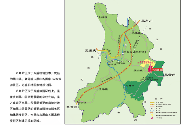 八角位于萬(wàn)盛經(jīng)開(kāi)區(qū)東南黑山鎮(zhèn),緊鄰重慶黑山谷國(guó)家5A級(jí)旅游景區(qū)、萬(wàn)盛國(guó)家地質(zhì)公園,是萬(wàn)盛城區(qū)至黑山谷景區(qū)重要的銜接過(guò)渡區(qū)和黑山谷景區(qū)的重要旅游接待服務(wù)區(qū)和休閑度假區(qū),也是未來(lái)黑山谷國(guó)家級(jí)旅游度假區(qū)創(chuàng)建的核心區(qū)域。