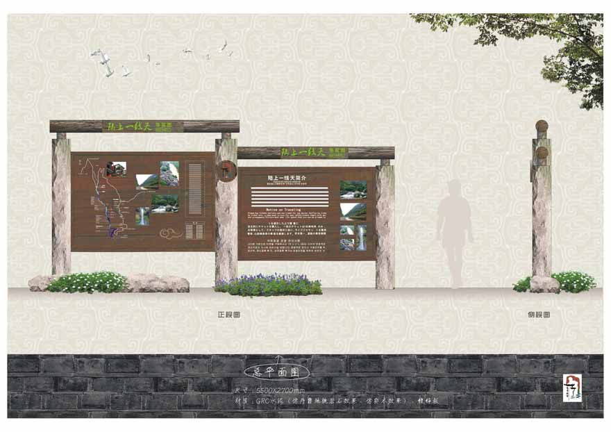材質(zhì):復(fù)古材料與新材料對比變化,青磚配鋁板腐刻、玻璃配灰瓦白墻。元素的自然統(tǒng)一,實木質(zhì)感、丹霞巖石,麻繩構(gòu)成金湖等以自然風(fēng)光為主的景區(qū)標(biāo)識系統(tǒng),造型以原木拼接為主,配以巖石基礎(chǔ),形成與環(huán)境融合,不突兀,個性粗狂。整套標(biāo)識造型風(fēng)格古樸、造型粗狂,與環(huán)境協(xié)調(diào),渾然天成,而且不失細(xì)節(jié)部分的完整。