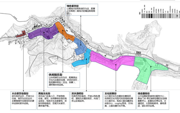 3、業(yè)態(tài)調整。增加具有文化內涵的住宿、餐飲、休閑、購物(土特產、工藝品等)業(yè)態(tài)類型,構建消費體驗型的古鎮(zhèn),并結合景觀和夜景營造良好的商業(yè)休閑氛圍。對長約2公里的劍門關古鎮(zhèn)街道業(yè)態(tài)分段分區(qū)調整,每個片區(qū)都具有主力業(yè)態(tài),但同時也需要混合布局。