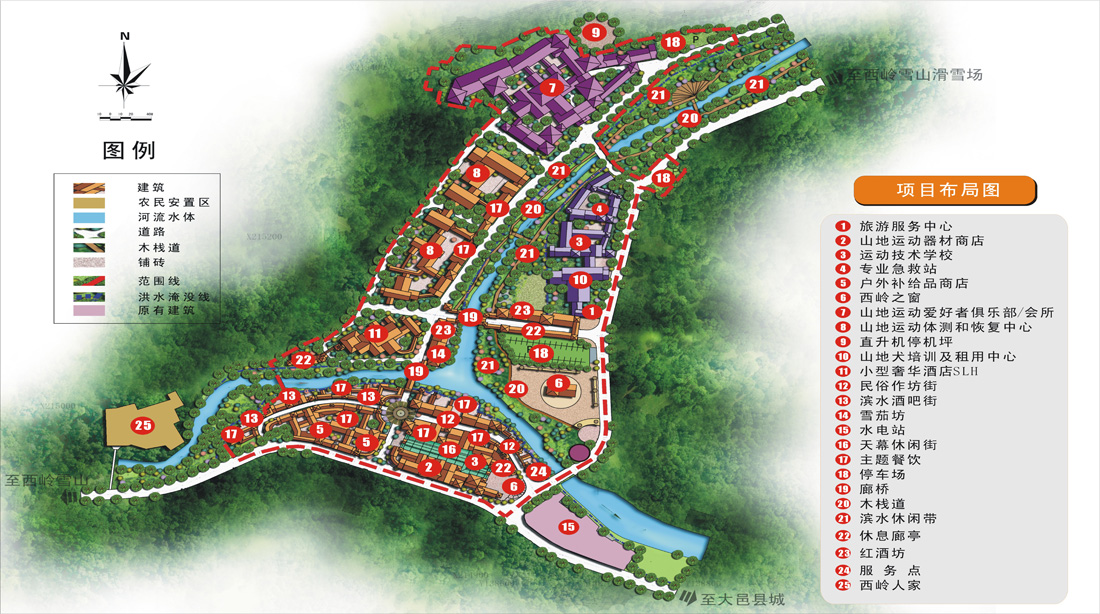 本項(xiàng)目空間結(jié)構(gòu)布局為“一、四、九”。即一條遺產(chǎn)走廊——安西遺產(chǎn)走廊產(chǎn)業(yè)軸;四大核心度假組團(tuán)——西嶺雪山觀光度假組團(tuán)、花水灣浪漫主題度假組團(tuán)、禪修道養(yǎng)度假組團(tuán)、安仁文博影視度假組團(tuán);九大風(fēng)情小鎮(zhèn)——西嶺戶外自助小鎮(zhèn)、花水灣溫泉小鎮(zhèn)、鶴鳴山道源小鎮(zhèn)、霧中山禪意小鎮(zhèn)、新場天府水鄉(xiāng)原味小鎮(zhèn)、安仁中國博物館小鎮(zhèn)、青霞澳洲昆士蘭小鎮(zhèn)、晉原恒大山水城、悅來山鄉(xiāng)養(yǎng)生小鎮(zhèn)。