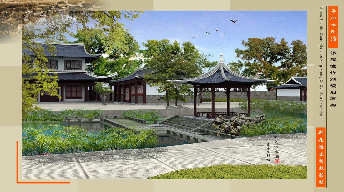本規(guī)劃以將李后主別館建成中國(guó)唯一的李煜紀(jì)念園林為目標(biāo),從項(xiàng)目命名的選取到建筑風(fēng)格的確定等,均體現(xiàn)了項(xiàng)目地的紀(jì)念性質(zhì)。根據(jù)市場(chǎng)分析和需求分析,設(shè)置了天凈橋、天上人間樓、春花秋月院、別是滋味閣等一系列項(xiàng)目,并通過(guò)建筑、街道、院落、水景、園林等的交融,將當(dāng)今世界最先進(jìn)的“情景互動(dòng)”觀賞、休閑、娛樂(lè)旅游與文化和環(huán)境進(jìn)行和諧整合。
