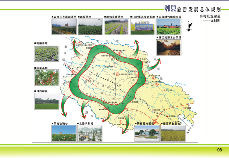 五組團:中國農(nóng)家樂旅游發(fā)源地旅游組團、望叢文化創(chuàng)意園旅游組團、安靖湖旅游組團、三道堰水鄉(xiāng)旅游組團、唐昌易鎮(zhèn)旅游組團