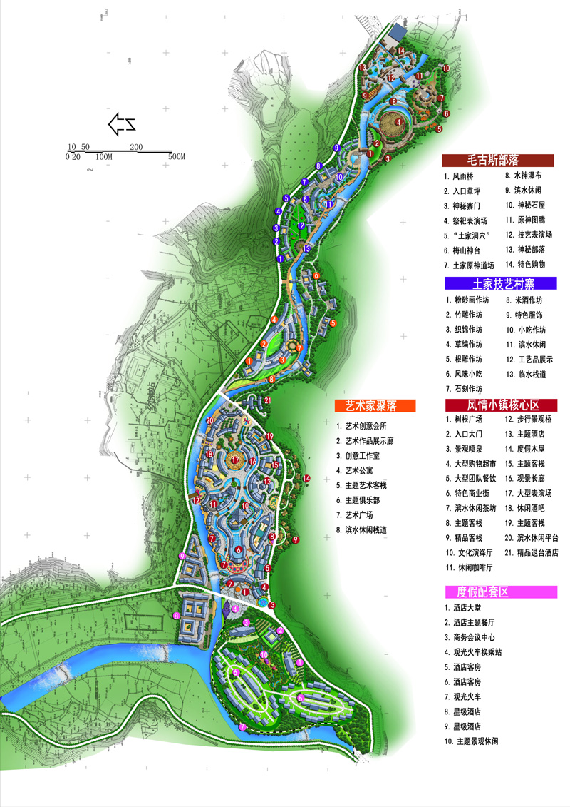 四區(qū):包括入口服務(wù)區(qū)、度假配套區(qū)、風(fēng)情小鎮(zhèn)核心區(qū)、土家風(fēng)情休閑區(qū)。