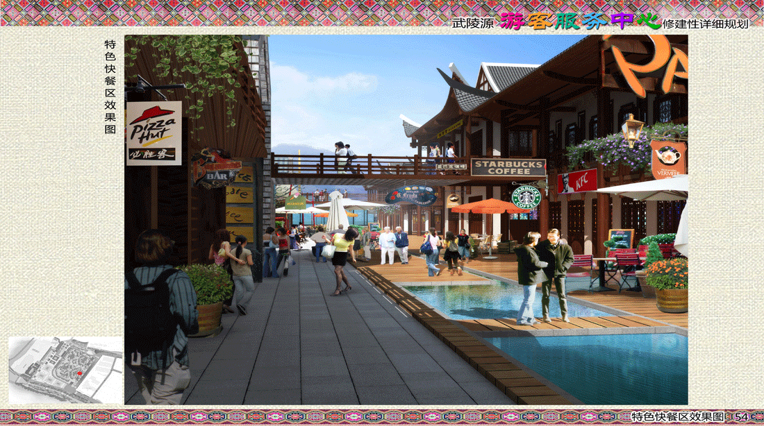文化展示區(qū),以西蘭卡普圖案為平面布置原型,按照白墻青瓦、轉(zhuǎn)角樓、吊腳樓、坡屋面的土家族傳統(tǒng)建筑風(fēng)格進(jìn)行打造,建筑由北向南分別為二、三、四層跌落式建筑,二層出挑,形成整齊的沿街界面;街巷內(nèi)部注重街區(qū)內(nèi)臨街建筑高度與步行街寬度比,局部增加水景觀作為點(diǎn)綴;在氛圍營造上,充分提取土家族文化元素,運(yùn)用于街區(qū)景觀小品、綠化、家具等,全方位凸顯地域文化特色。