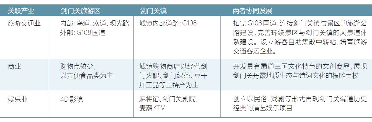 劍門關(guān)鎮(zhèn)以發(fā)展特色住宿餐飲業(yè)為主導(dǎo),劍門關(guān)旅游區(qū)以發(fā)展旅游觀光產(chǎn)業(yè)為主,共享蜀道文化、劍門詩詞文化與丹霞生態(tài)環(huán)境。統(tǒng)籌景區(qū)與旅游特色小鎮(zhèn),協(xié)同發(fā)展區(qū)域內(nèi)娛樂業(yè)、商業(yè)、旅游交通業(yè)等關(guān)聯(lián)行業(yè),實(shí)現(xiàn)景區(qū)與特色小鎮(zhèn)的延伸融合。